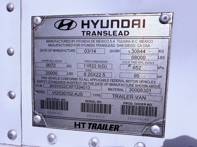 Hyundai Translead 53′ Dry Van, 2015 Vehicle Specification